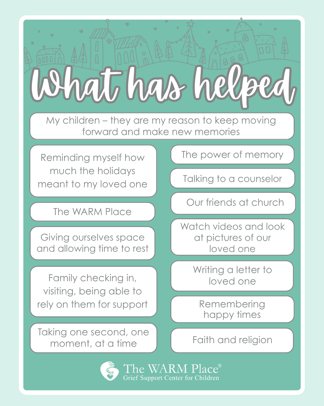 Recently, we asked adults currently attending The WARM Place to share what they plan to keep the same, what they plan to do differently, and what has helped them get through the holidays up to now. Below you will find some of their responses.